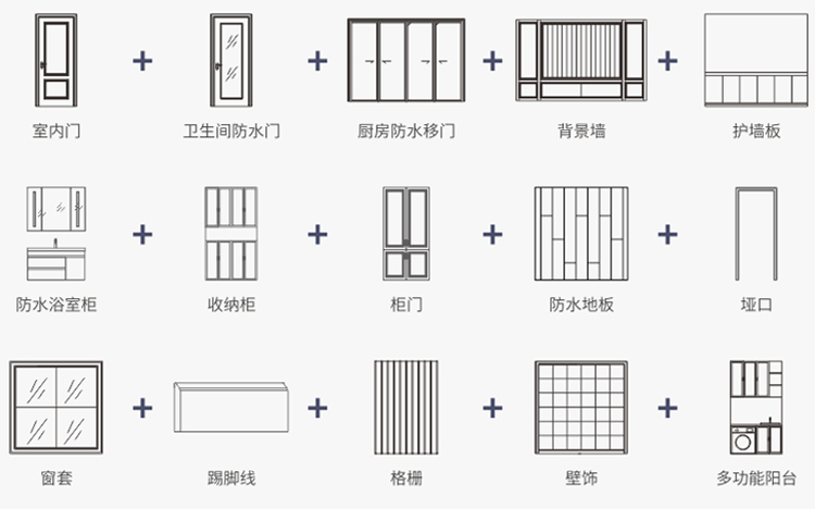 家装工装一店经营多态门墙柜15大品类,单品卓越,系统打造、风格一体、智美融合。