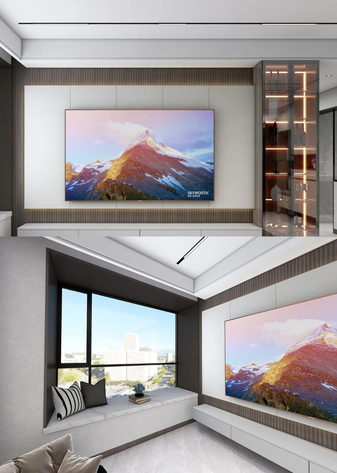 - 电视背景墙以墙柜一体的姿态,诉说着简约的深情。格栅墙面如岁月纹理,平板叠加其上,似是时光的层叠。玻璃柜门轻启,内置灯带如星子闪烁,照亮了那些心爱的珍藏。
